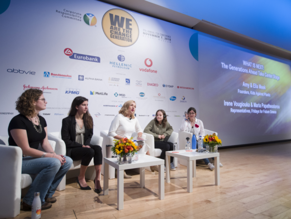 Snapshot from the 17th Annual CSR Conference WHAT IS NEXT The Generations Ahead Take Center Stage -Amy & Ella Meek, Founders, Kids Against Plastic -Irene Vougiouka & Maria Papatheodorou, Representatives, Fridays for Future Greece Moderator: Elena Papadimitriou, Journalist, SKAI TV & Radio