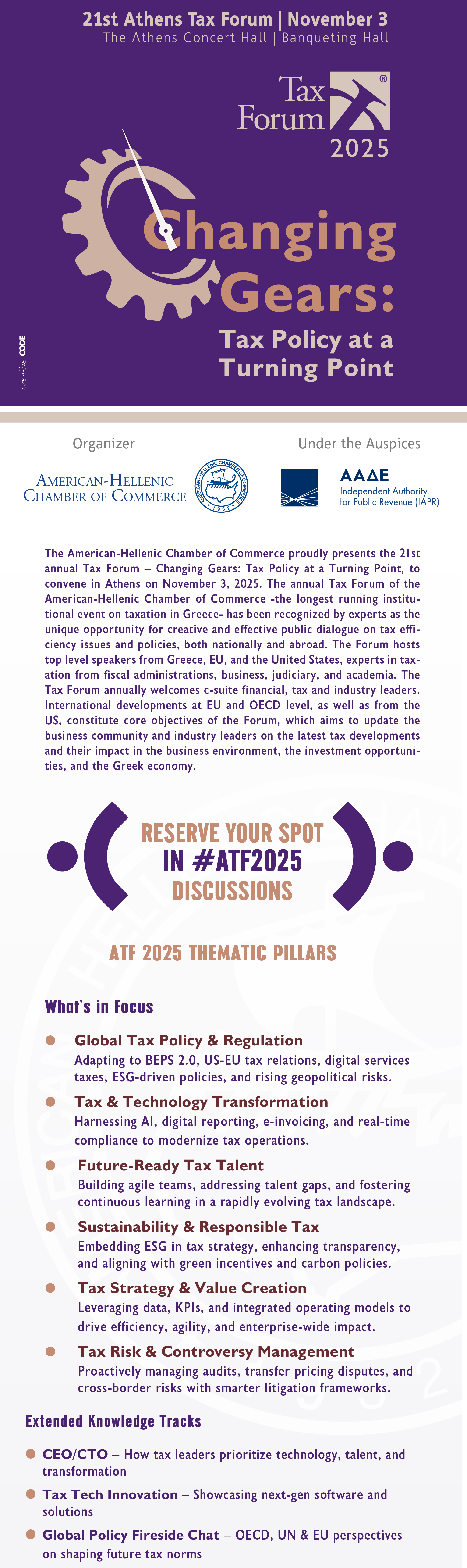 November 3, 2025 The Athens Concert Hall, Banqueting Hall Vas. Sofias & Petrou Kokkali, Athens, Athens, 11521, Greece REGISTER HEREDetailed Thematic Pillars More Info Katerina Tzagaroulaki, 2106993559 ext. 22, k.tzagaroulaki@amcham.gr Fani Zourou, 2310286453, f.zourou@amcham.gr